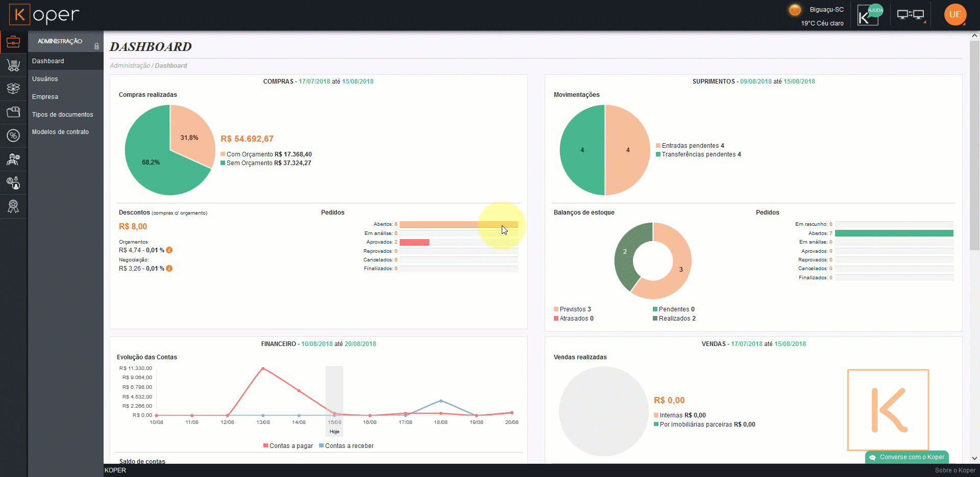 Após o login, o usuário será direcionado à página Dashboard, o “Painel de Controle” do Koper, com as informações segmentadas pelo período dos últimos 30 dias.