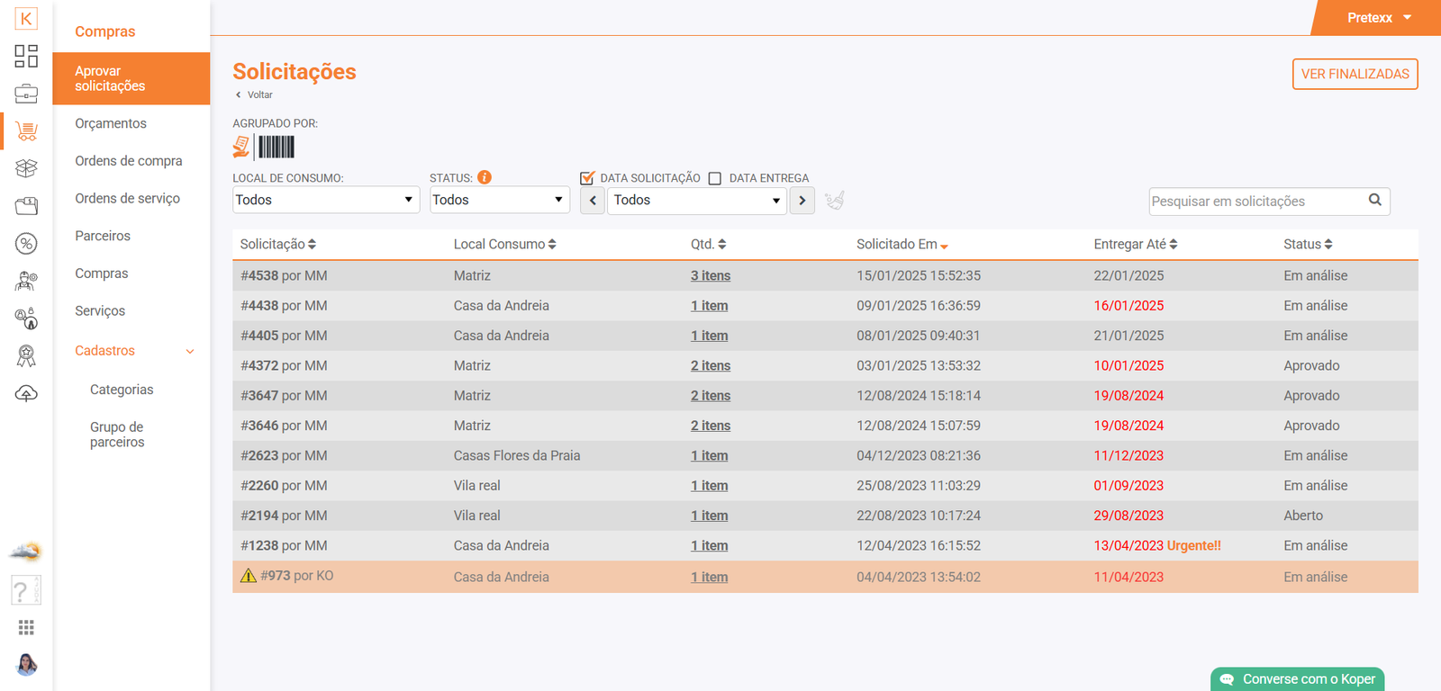 Neste módulo, o usuário tem acesso total a todas as etapas que fazem parte do ato de compra, desde o cadastro de empresas parceiras (que podem ser transportadoras, fornecedores, prestadores de serviço, etc.), o pedido de orçamento para um conjunto de itens, a emissão e aprovação de ordens de compra e de serviço, entre tantas outras ferramentas que o Koper oferece.