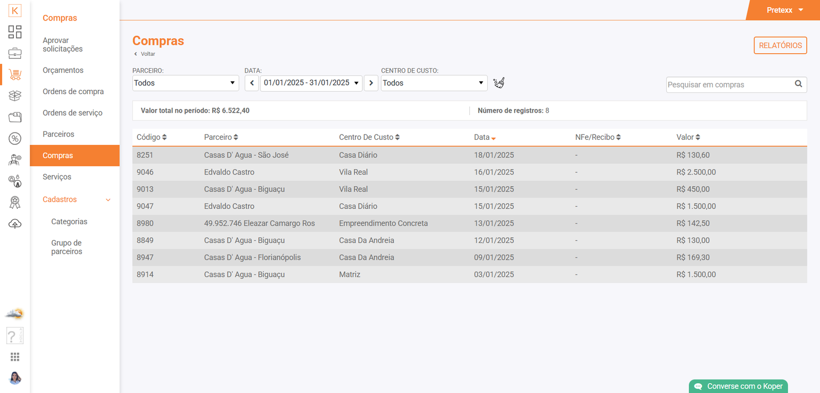 Espaço para verificar as compras já realizadas anteriormente, podendo filtrar por parceiros, data e centro de custo.