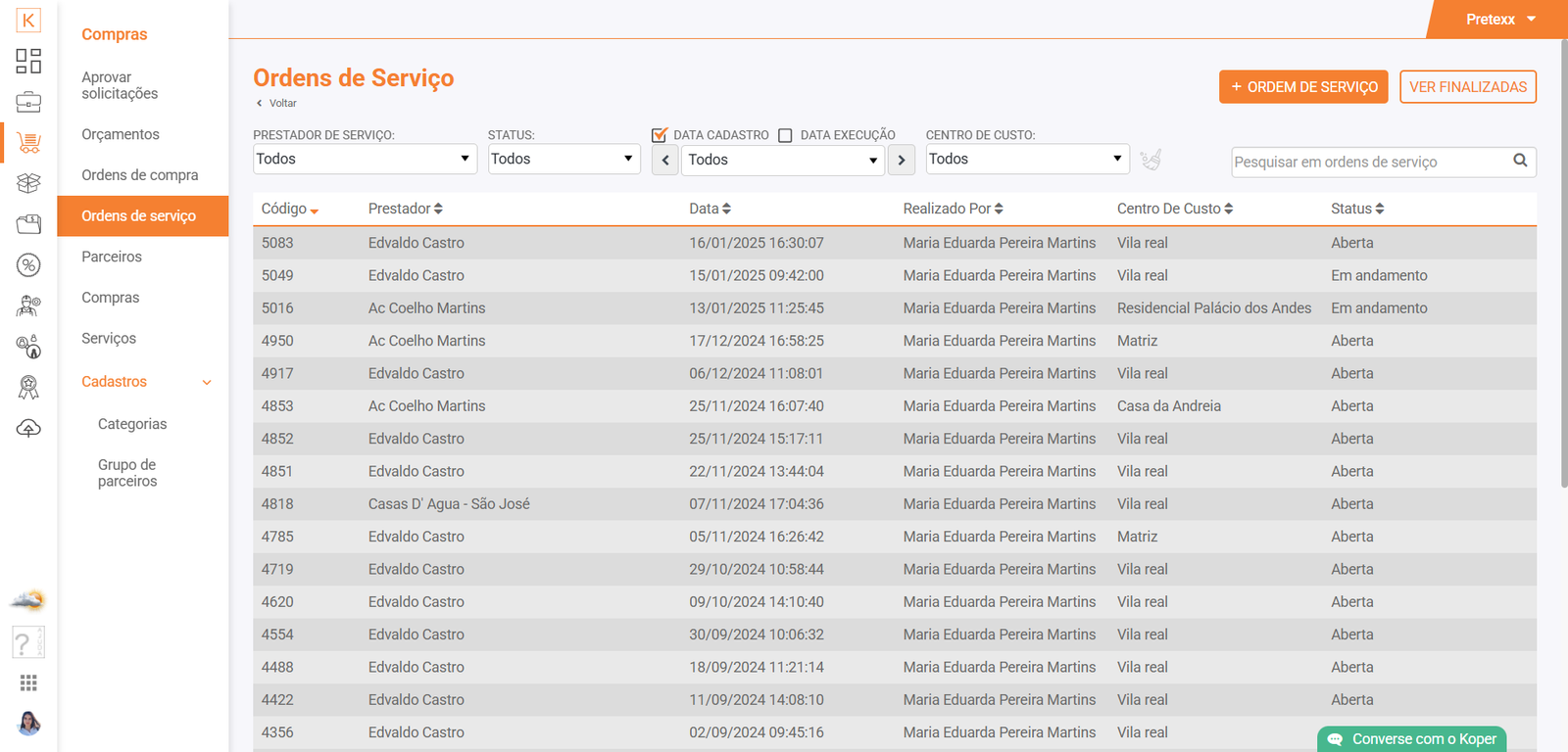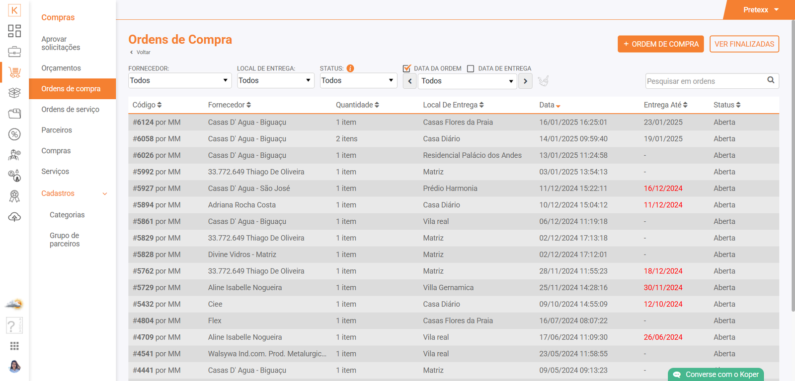 São exibidas as ordens de compra emitidas, de maneira ordenada e passívas de filtragem por fornecedor, local de entrega, status e/ou data e pesquisa direta. Ainda é possível criar a qualquer momento, sem necessidade de um orçamento prévio.
