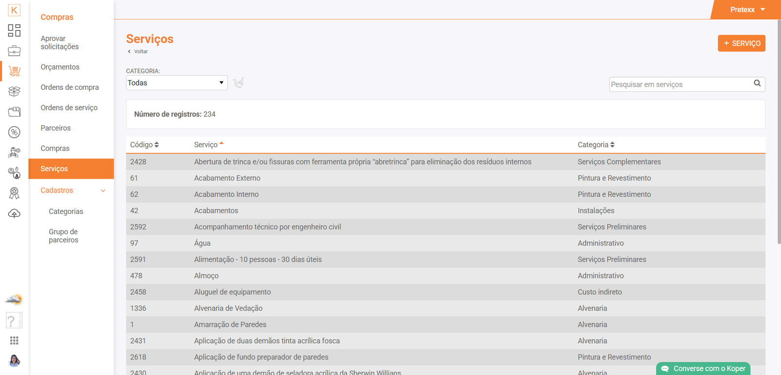 É feito aqui o cadastro de novas categorias de serviços. Também pode ser feito na página Compras > Serviços ou direto no cadastro de nova ordem de serviço.