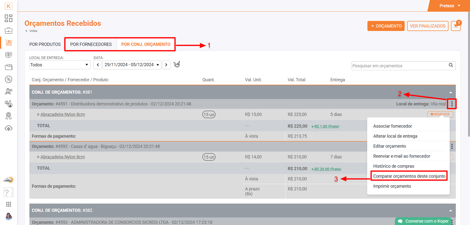 - Selecione o tipo de visualização "Por fornecedores" ou "Por conj. orçamentos";