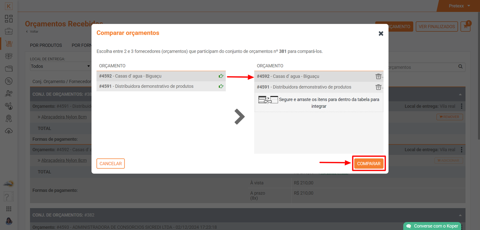 - Uma janela será aberta. Escolha entre 2 e 3 fornecedores (orçamentos) que participam do conjunto de orçamentos, para compará-los;