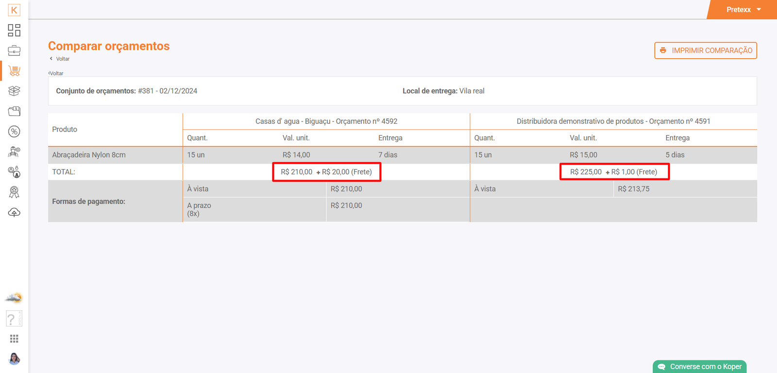 - 7. Analisar o comparativo entre melhor valor / entrega mais rápida nos orçamentos de produto;