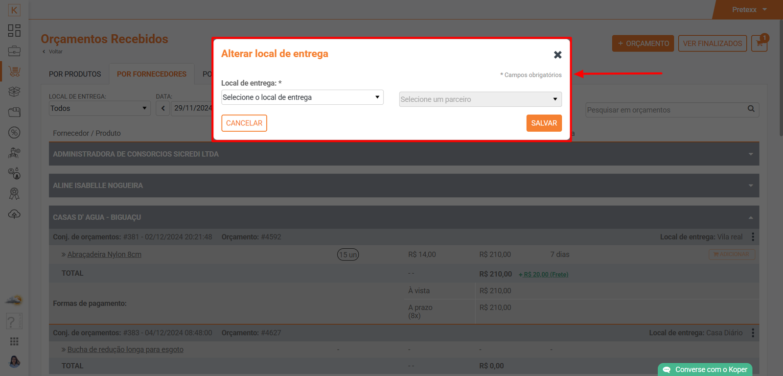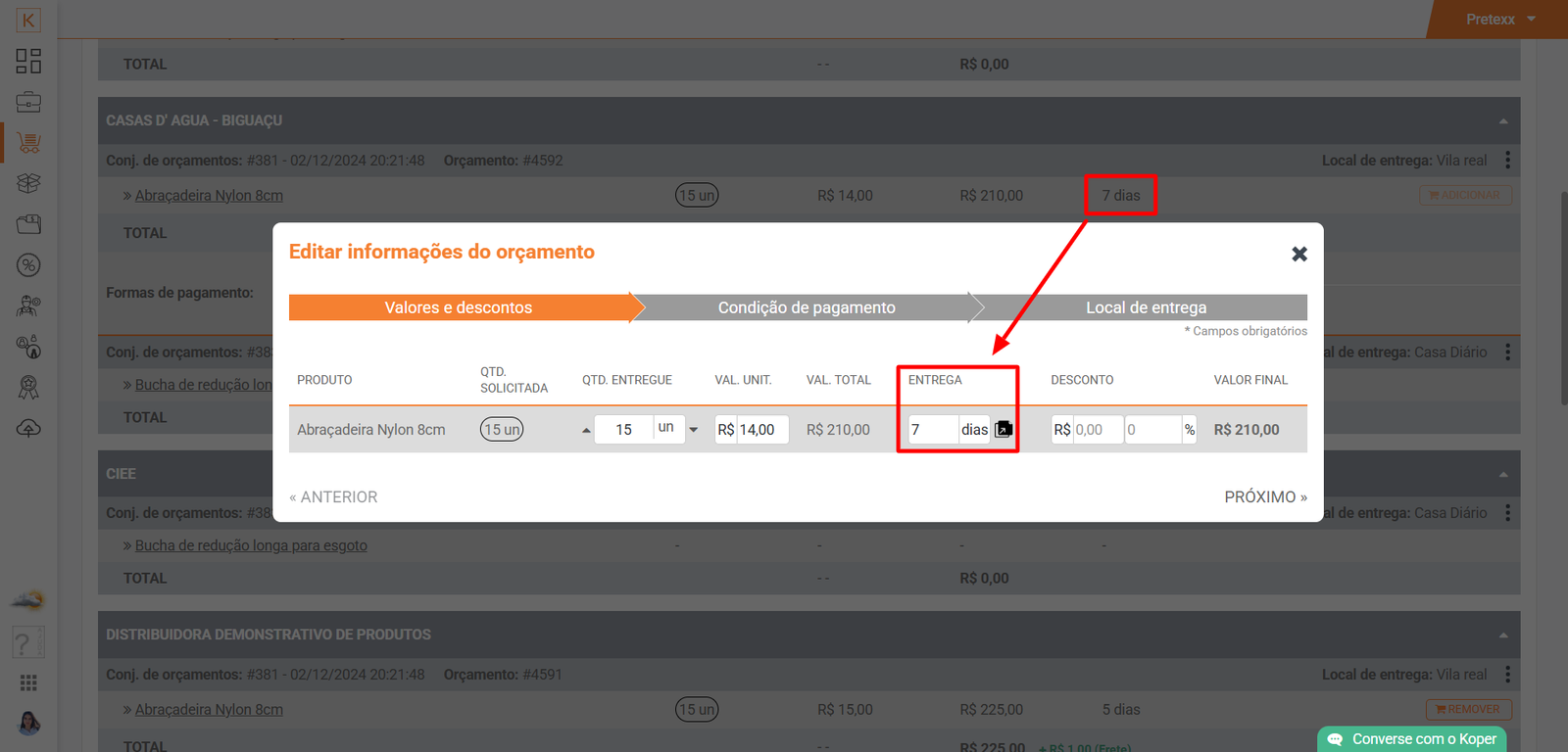 COMO ALTERAR LOCAL DE ENTREGA EM UM ORÇAMENTO