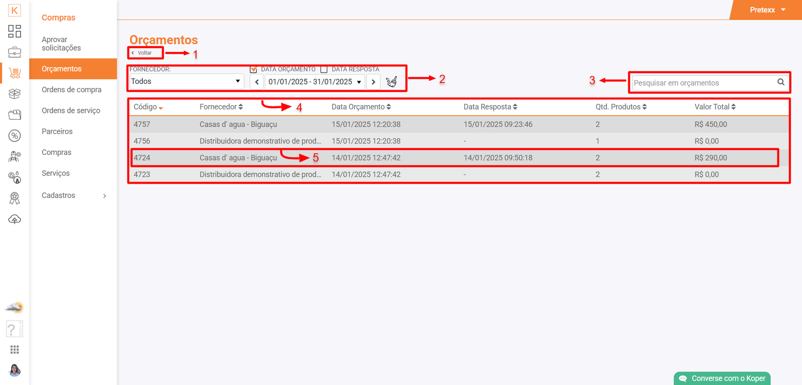 - 2. Filtrar por fornecedor, data de orçamento / data de resposta;