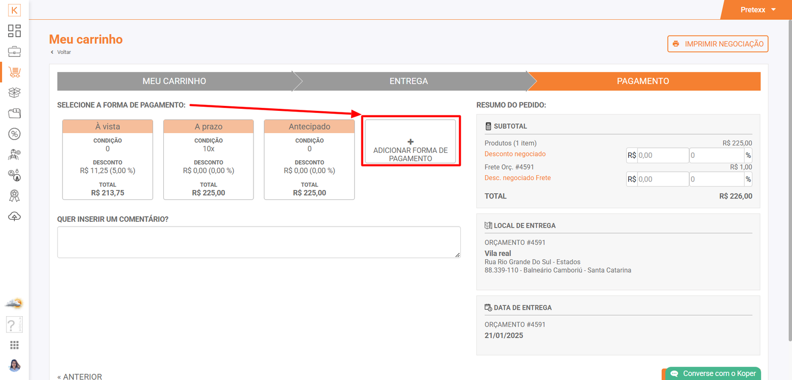 COMO CRIAR NOVA CONDIÇÃO DE PAGAMENTO DURANTE A NEGOCIAÇÃO NO CARRINHO DE COMPRA