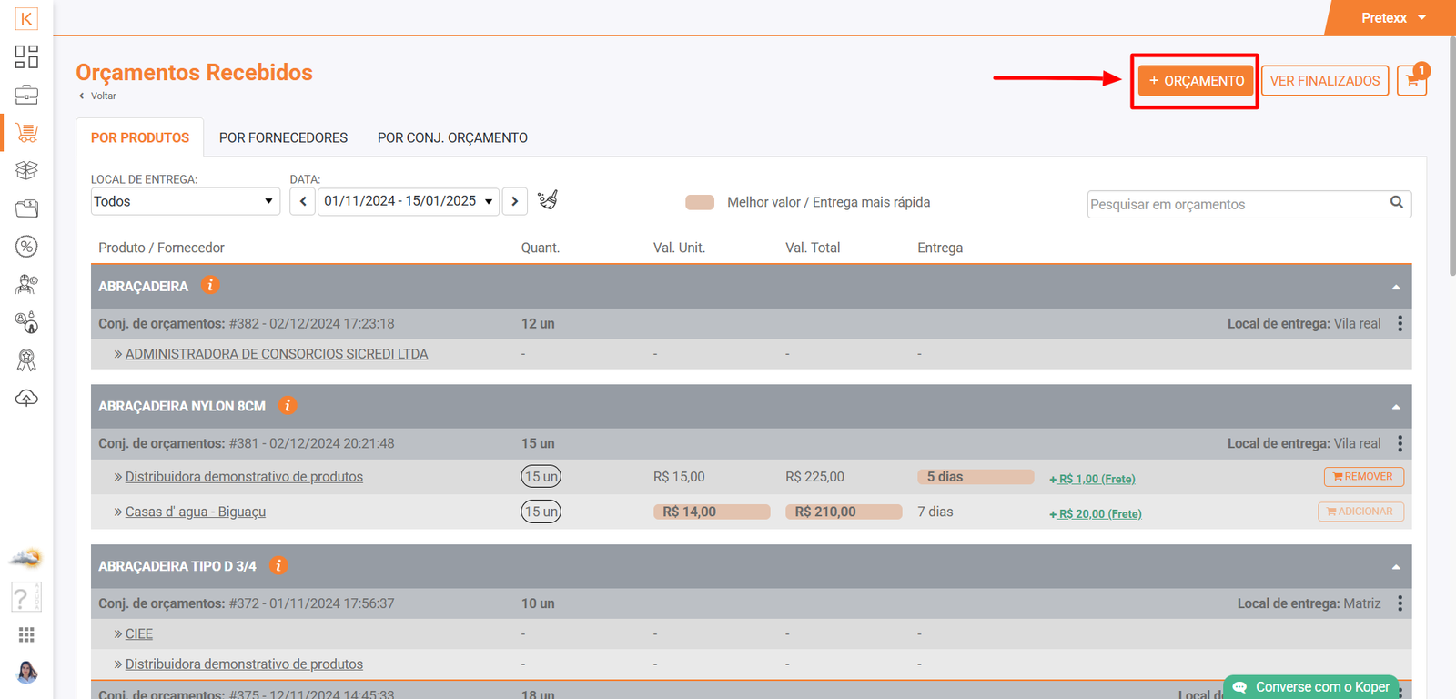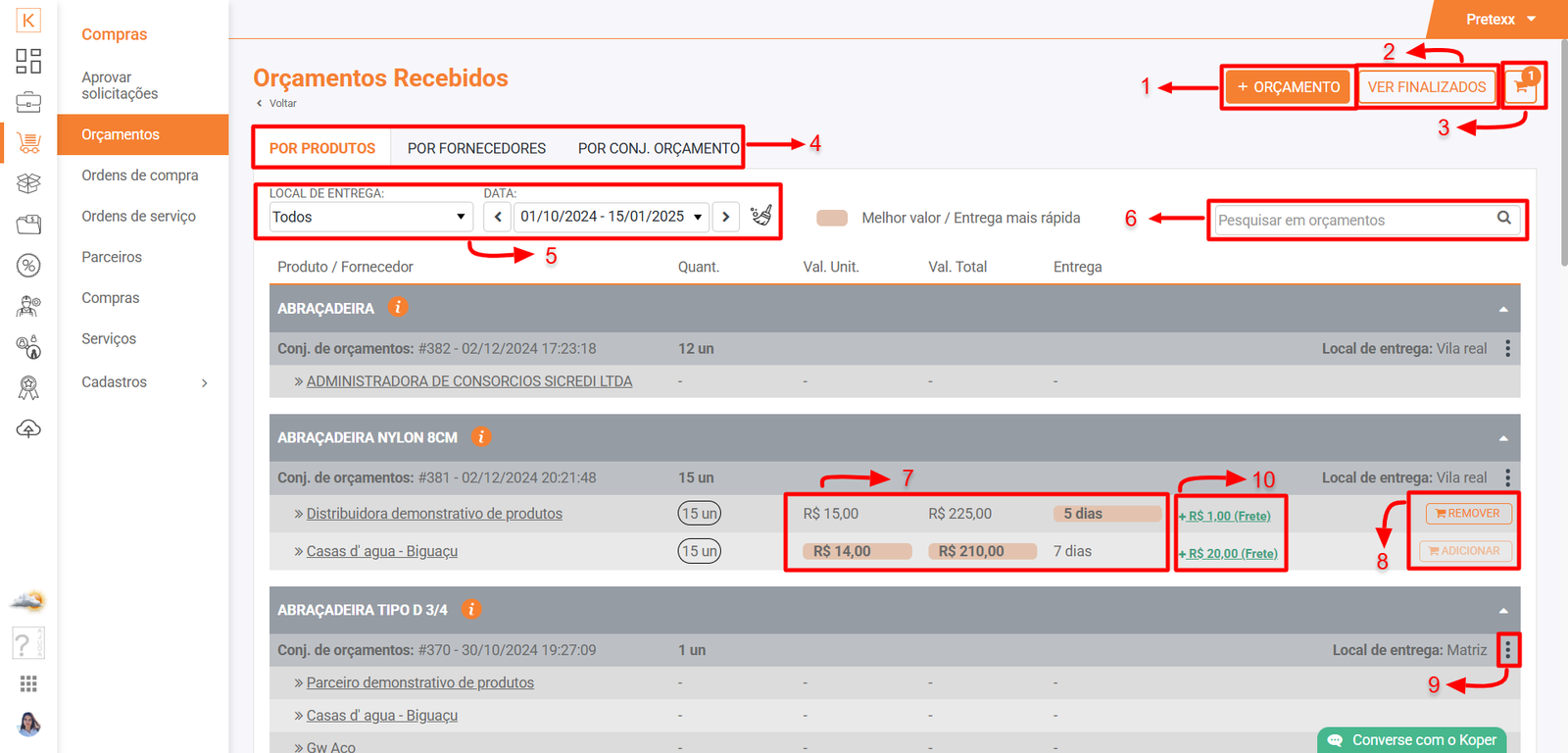 Ao entrar no módulo, o usuário poderá visualizar os orçamentos enviados e os recebidos, agrupados por produto ou por fornecedor. Já nos orçamentos respondidos, o sistema ainda destaca quais possuem melhor valor ou entrega mais rápida comparado aos demais.