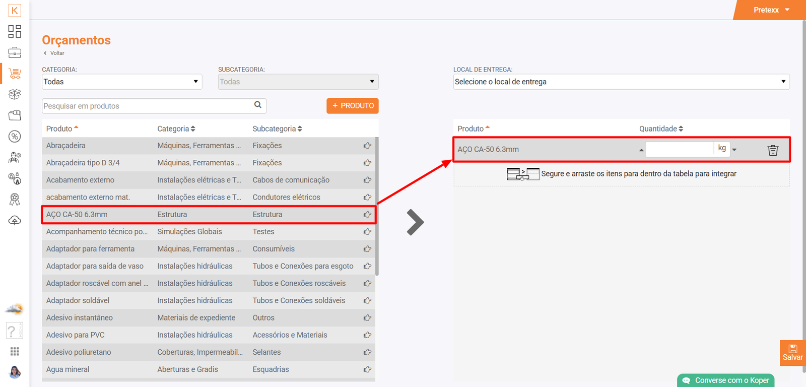 - Agora clique sobre o item que deseja adicionar ao orçamento, na lista da esquerda e arraste para a lista da direita, ou clique sobre o ícone