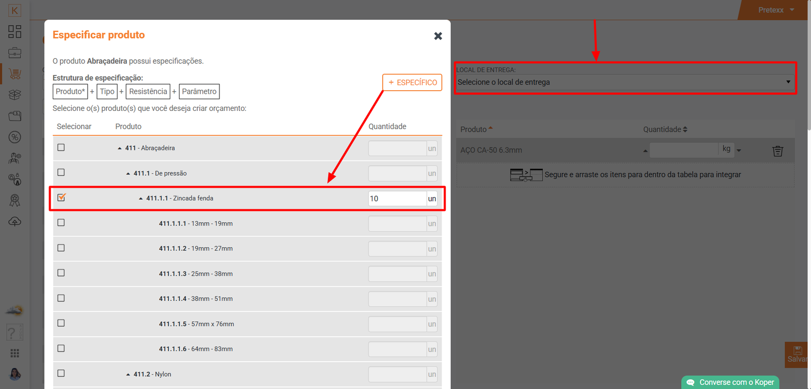 - Na aba Local de entrega, defina a validade deste orçamento, qual o tipo e valor do frete;