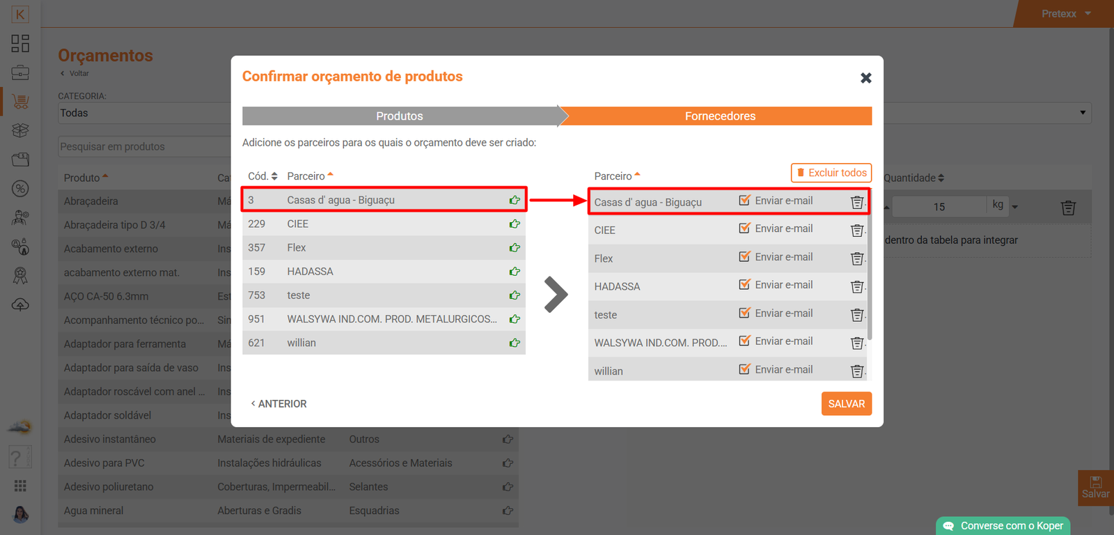 - Na aba Fornecedor, adicione na coluna da direita os perceiros que deseja fazer orçamento dos insumos que selecionou;