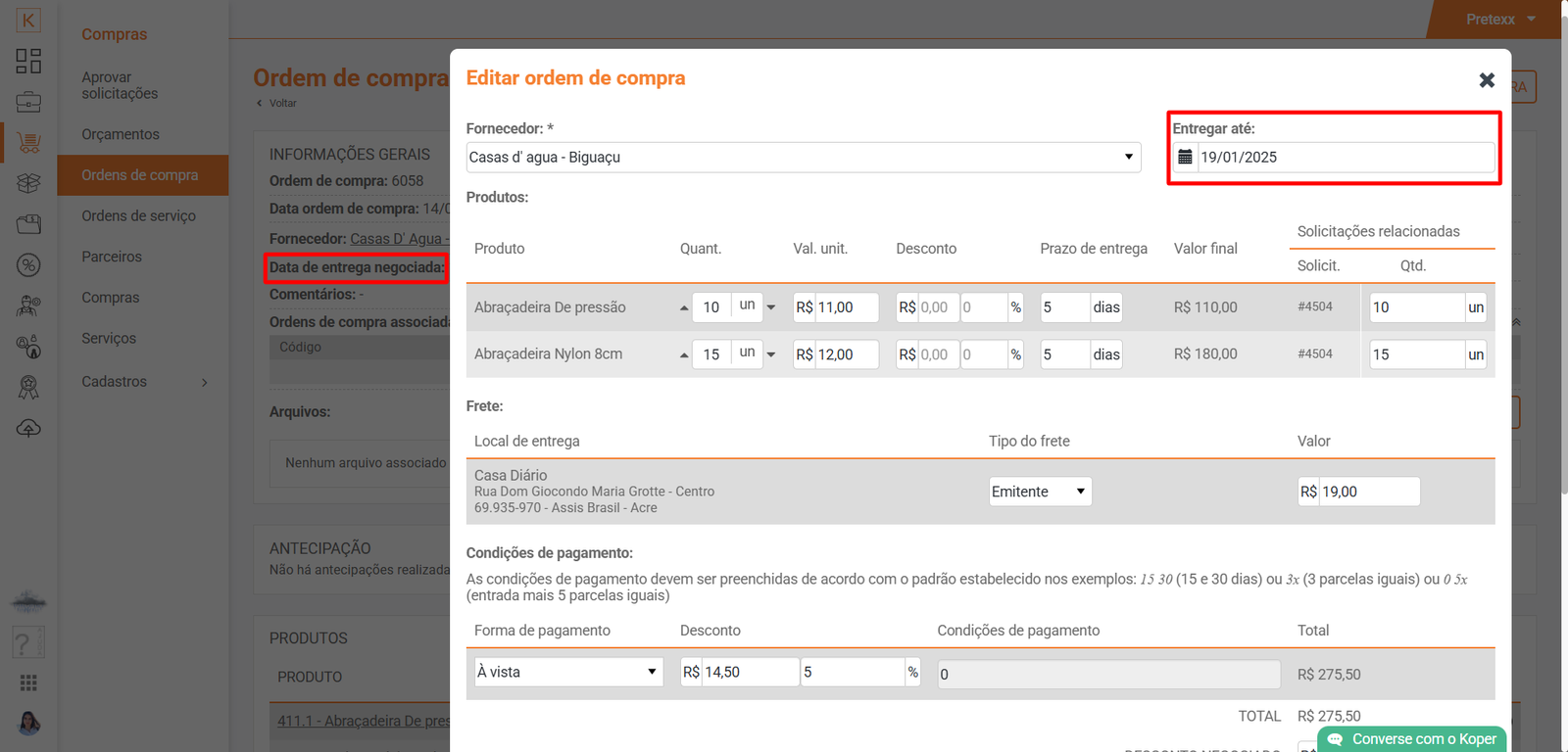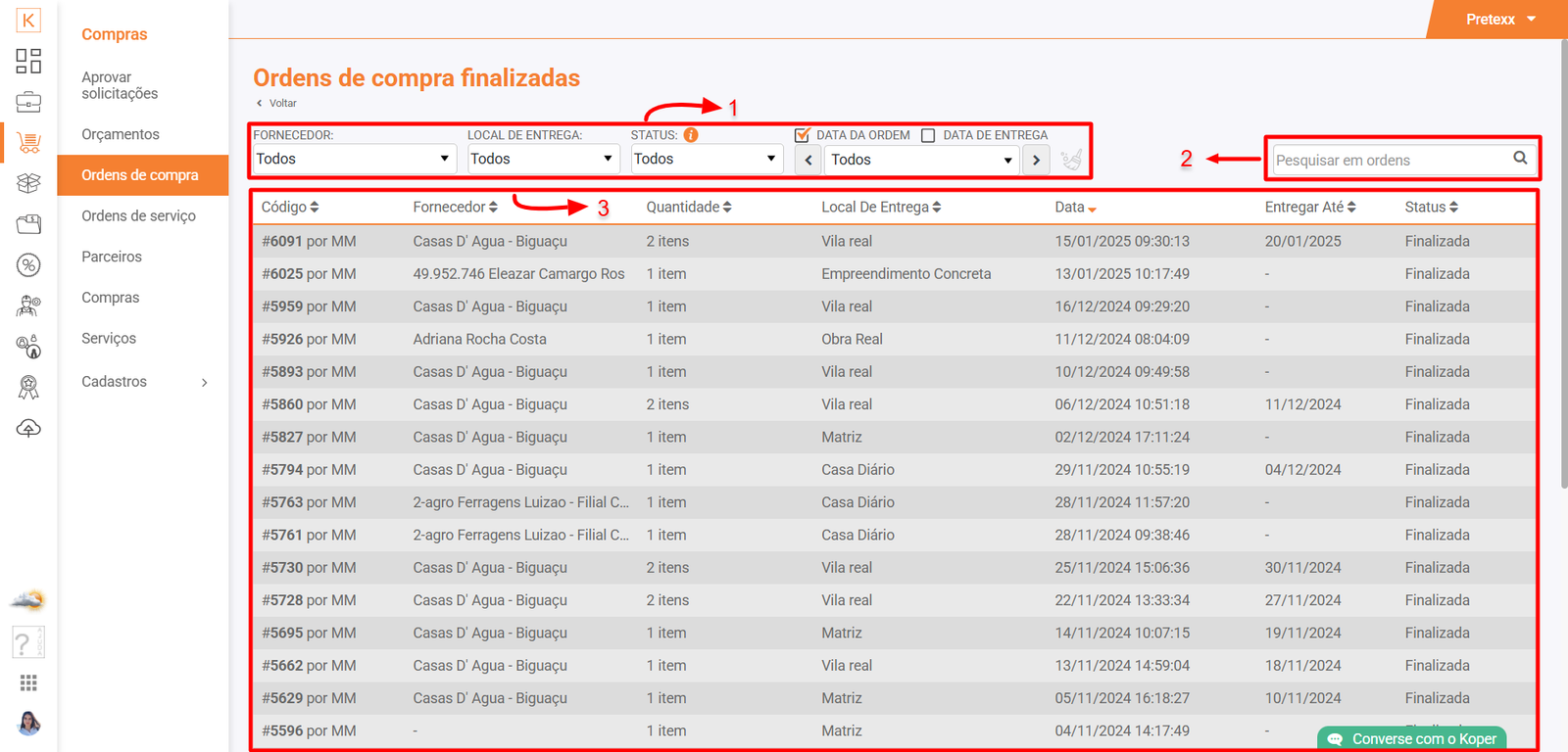 Acesse Koper > Compras > Ordens de compra