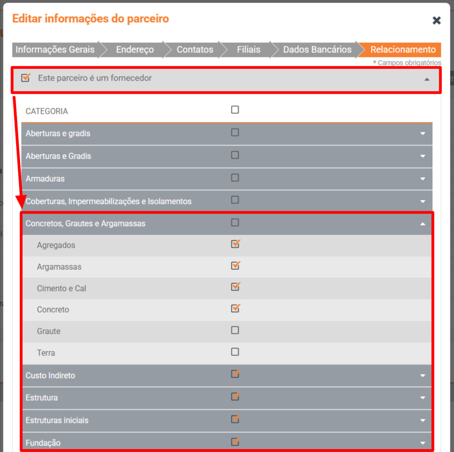 - Nas categorias selecione quais tipos de insumos ele disponibiliza;