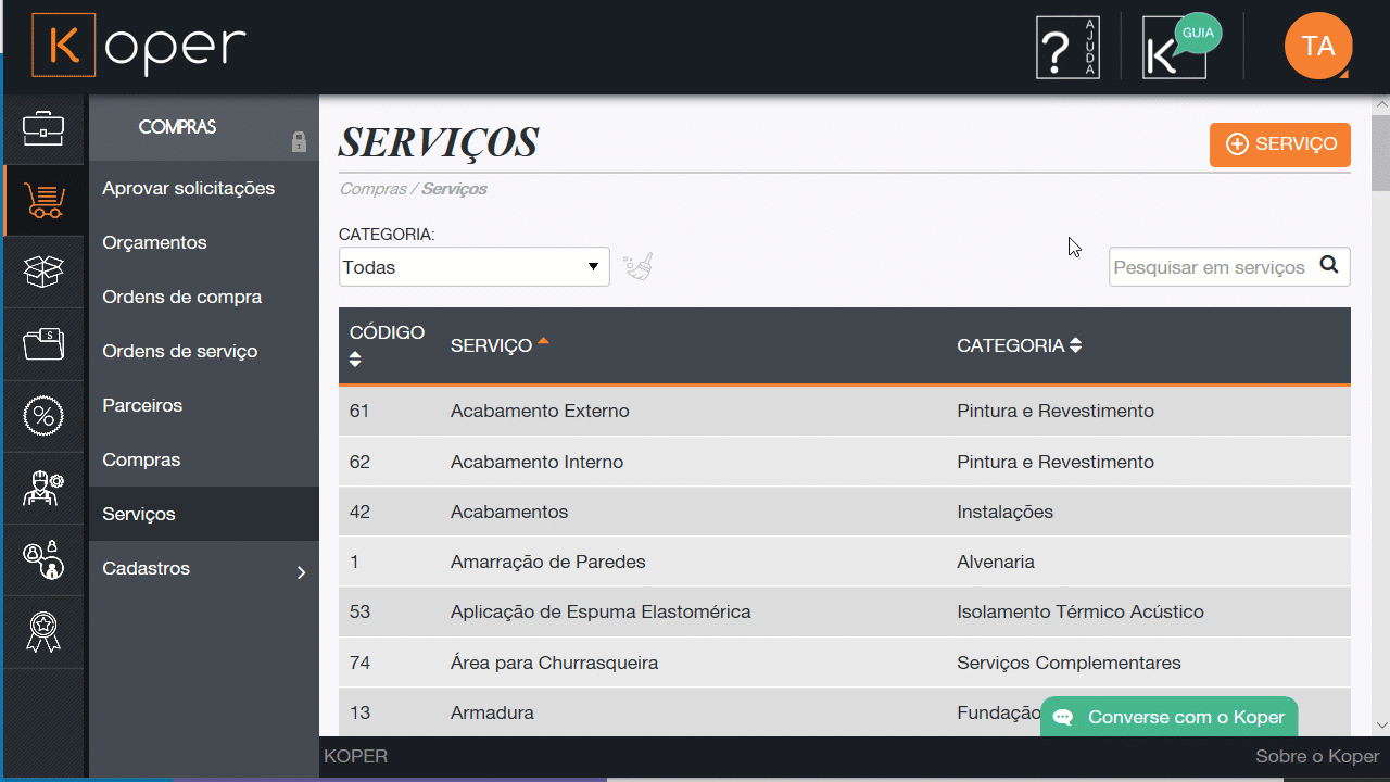 Nesta página você encontra os serviços já cadastrados pelo Koper. Também é possível, cadastrar novos tipos de serviços, que serão usados no cadastros de ordens de serviço.
