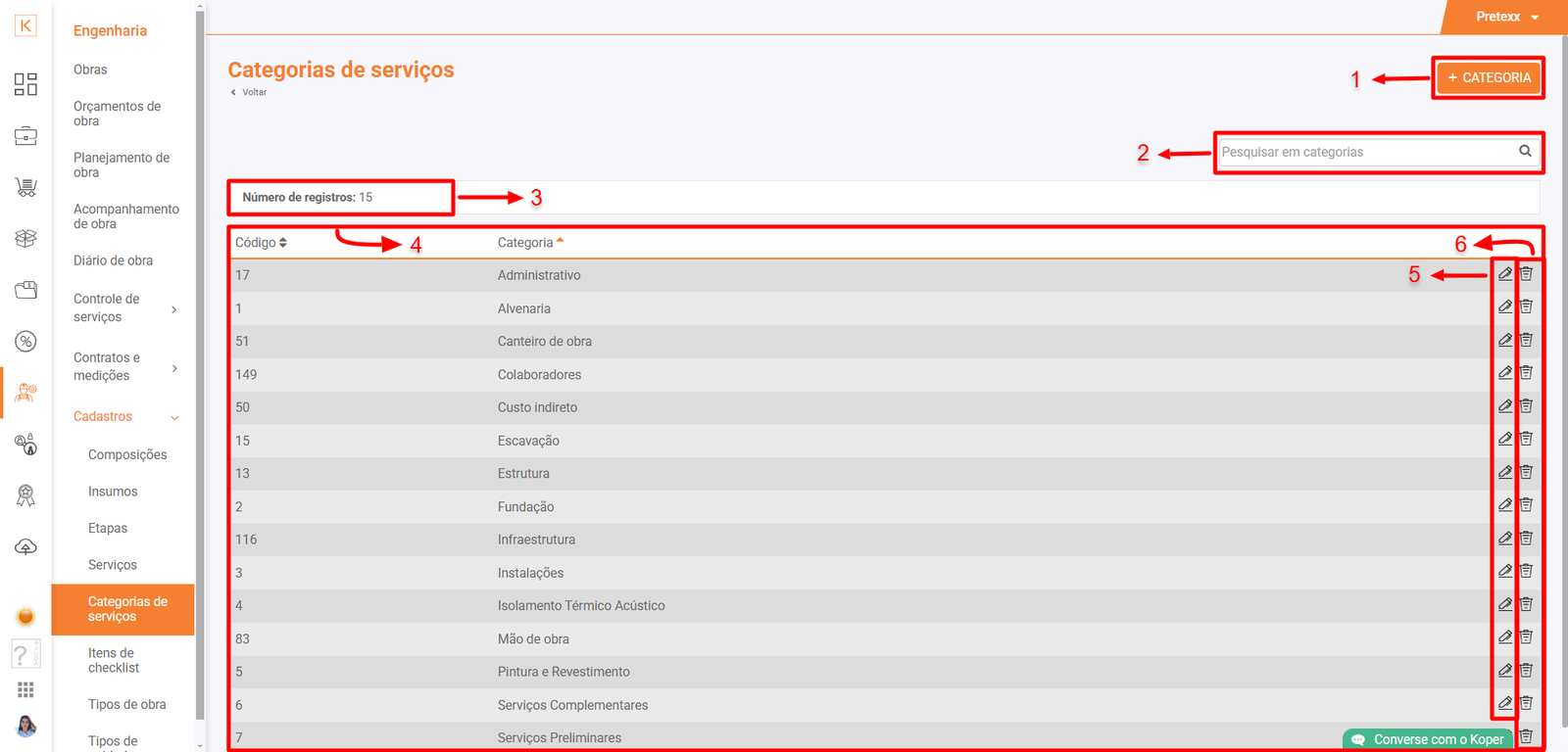 Acesse Koper > Engenharia > Cadastros > Categorias de serviços