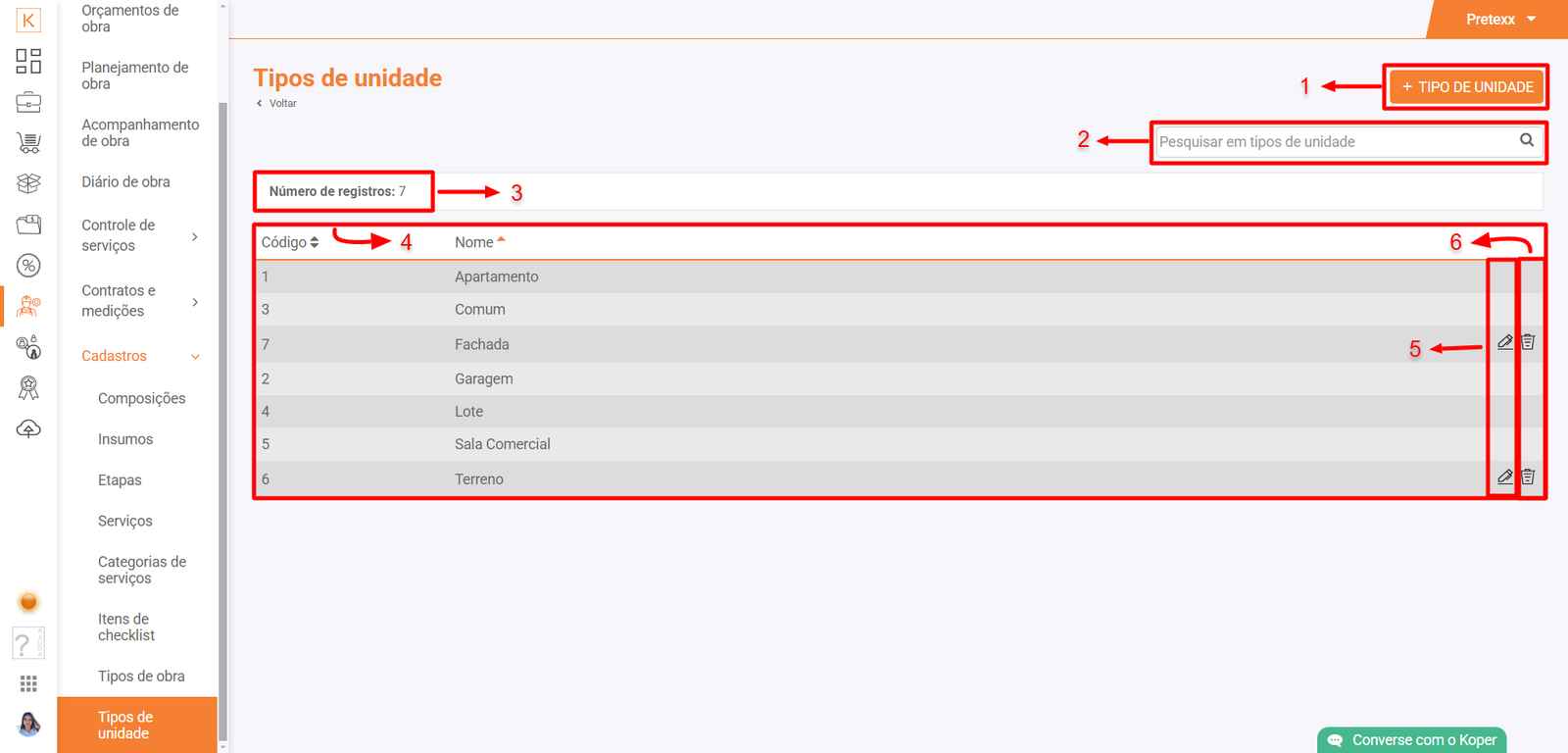 O Koper já trás alguns tipos de obra cadastrados para facilitar o trabalho, mas também te apresenta a possibilidade de realizar este cadastro tanto aqui, quanto no cadastro de sua obra.