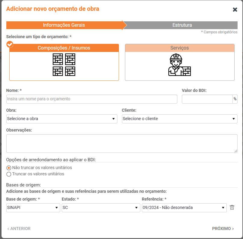 - Lista de insumos: onde estão listados todos os insumos de seu orçamento