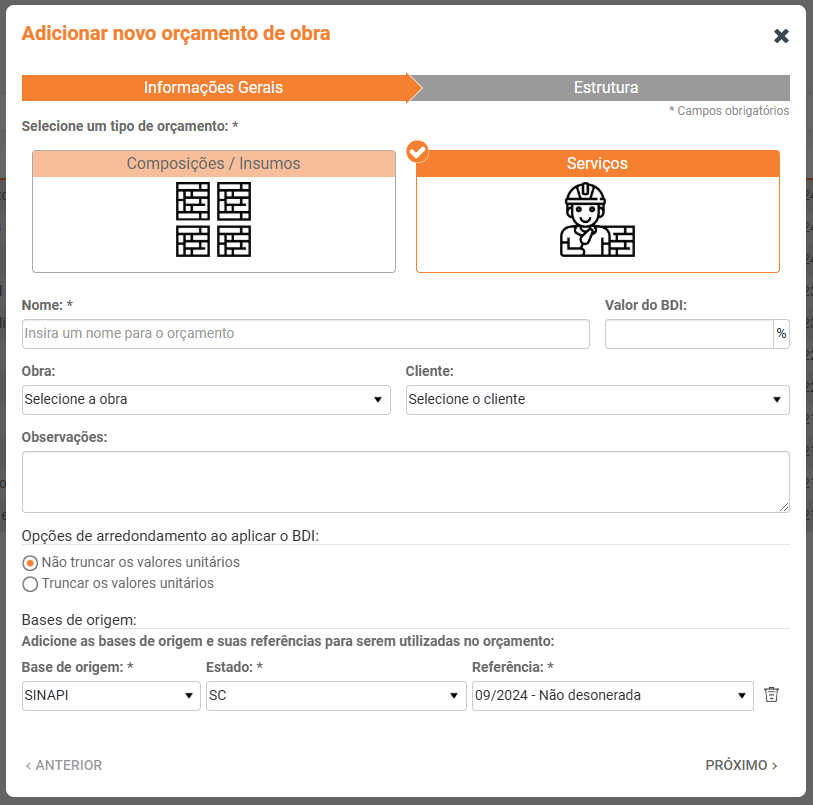 Antes de criar o seu orçamento, não se esqueça de criar Etapas, Serviços e Composições.