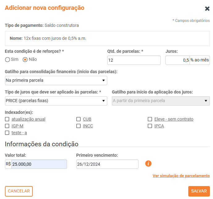 - E isso não é tudo, depois de configurar as condições especiais, ainda tem como Ver simulação de parcelamento (onde terá uma prévia de como serão as parcelas com as configurações que definiu, sobre o valor estipulado);