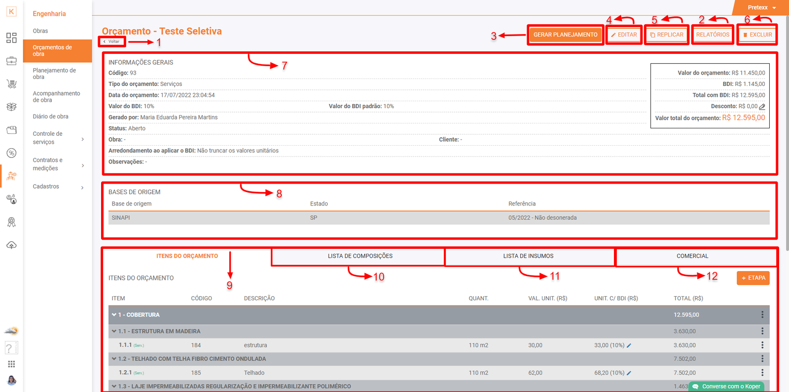 - Orçamento (com BDI em todos os itens): seu orçamento com porcentagem de BDI aplicada sobre todos os itens