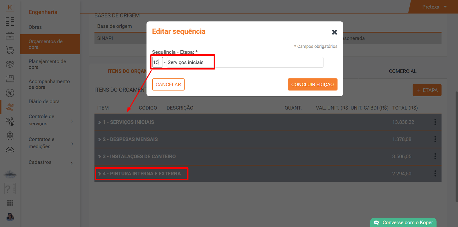 - Na aba de ITENS DO ORÇAMENTO identifique a etapa a qual deseja editar e clique em