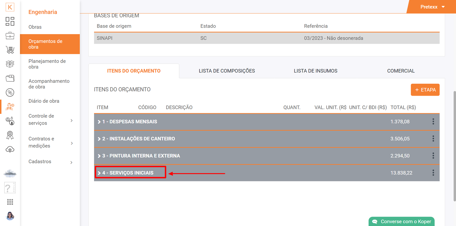 - Na aba de ITENS DO ORÇAMENTO identifique a etapa ou subetapa a qual este serviço esta inserido e clique em