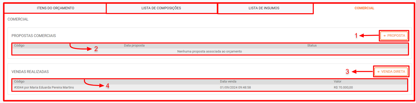 - Em orçamentos vinculados a obras para terceiros a aba Comercial é habilitada. Enquanto em obras próprias ela não é apresentada;