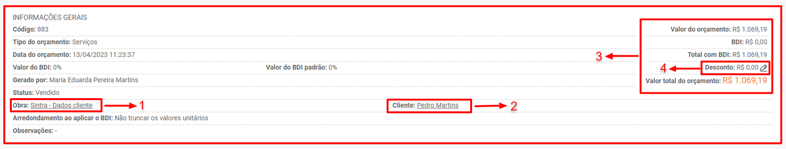 Aqui você pode ver todas as Informações Gerais do orçamento, e ainda pode: