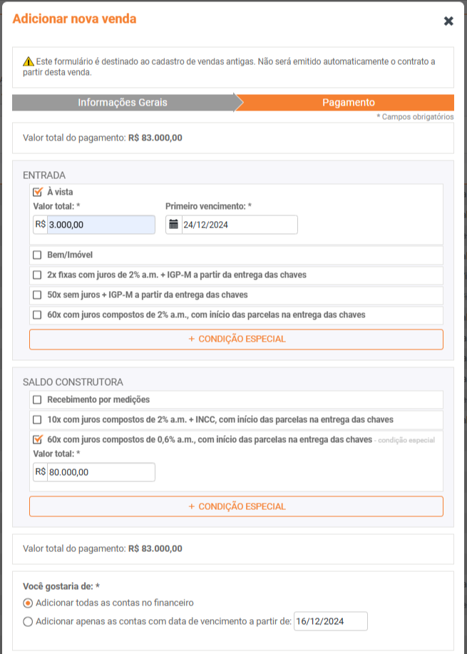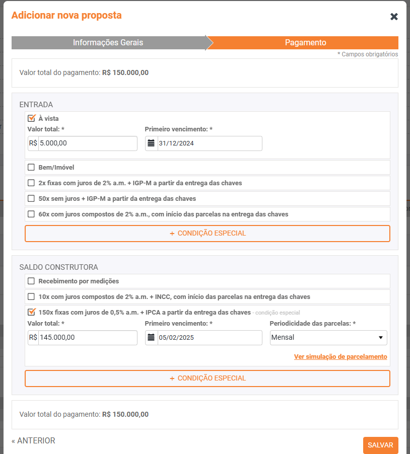 - Na aba de pagamentos configure a proposta comercial para este orçamento;