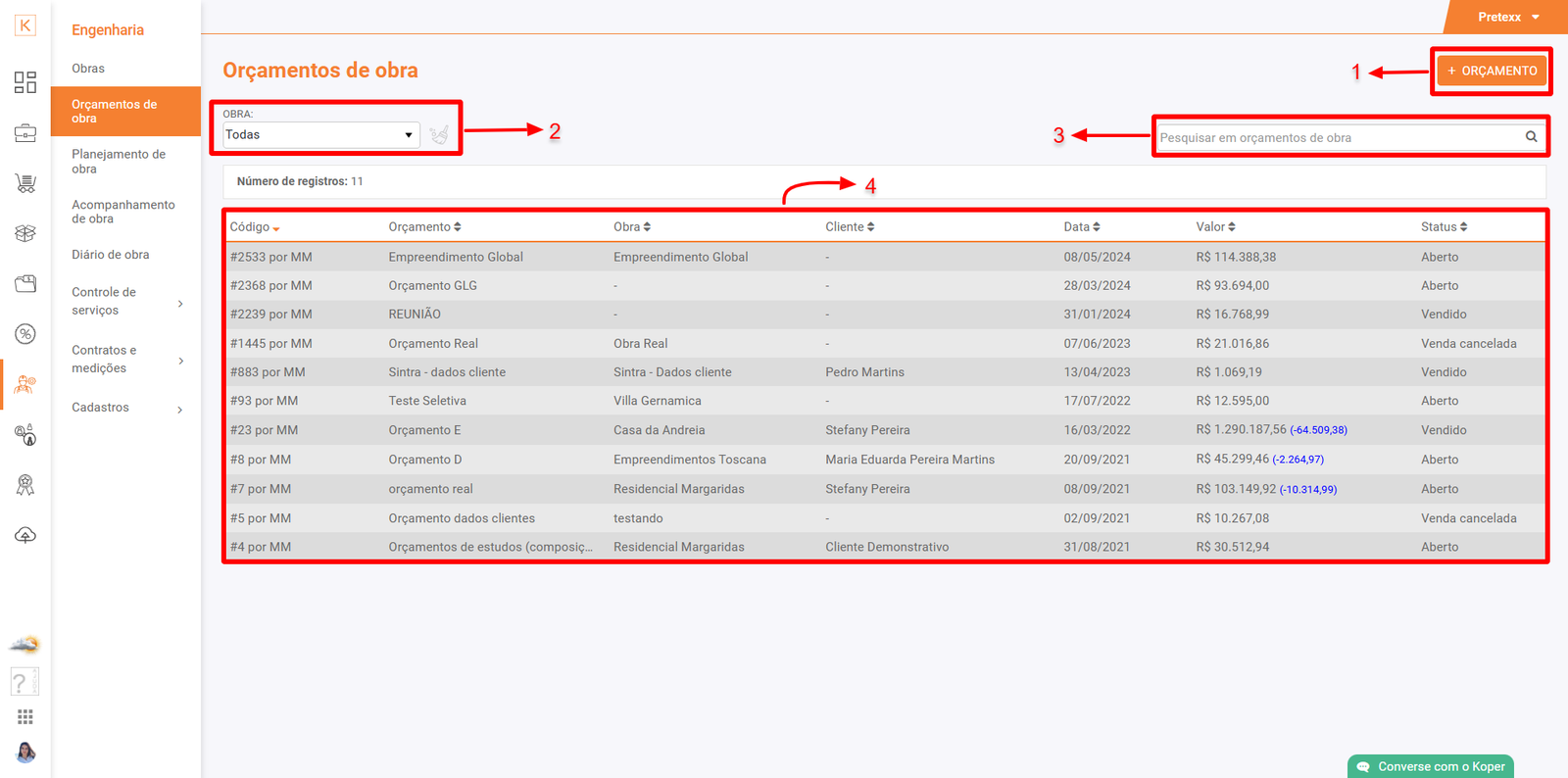 - 4: Visualizar orçamentos cadastrados: Cód, Nome, Obra, Cliente, Data, Valor(com BDI e Descontos) e Status;