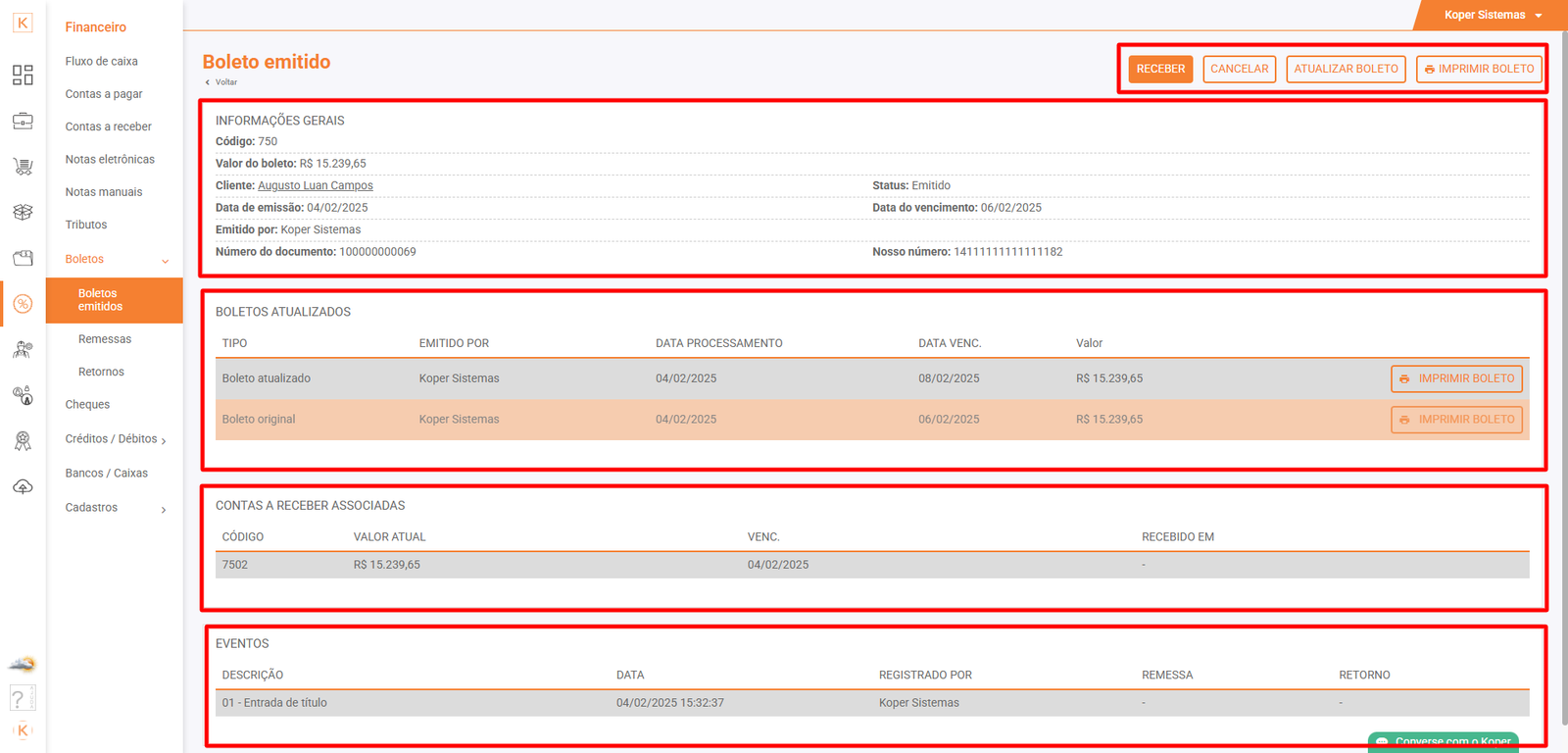 - Contas a receber associadas: mostra qual conta a receber este boleto está relacionadas;
