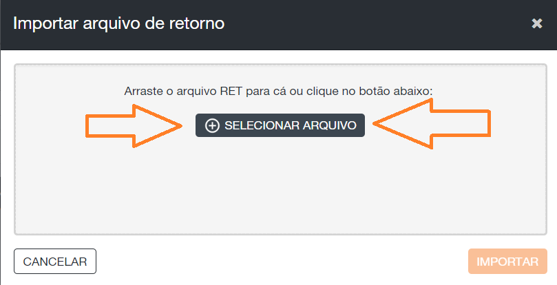 - Selecionar o arquivo .RET que você já baixou anteriormente (no site do seu banco) clicando em + SELECIONAR ARQUIVO