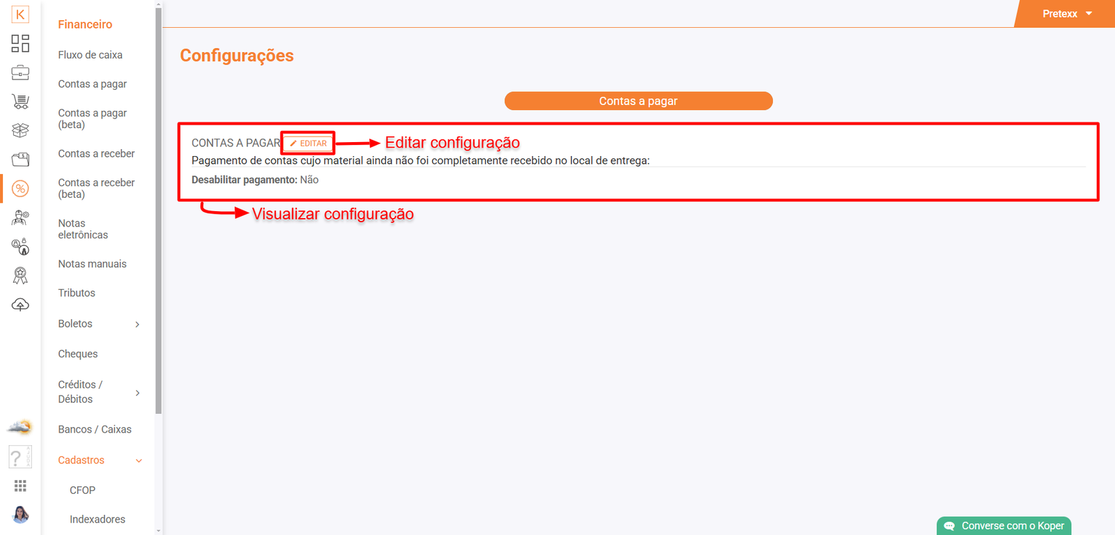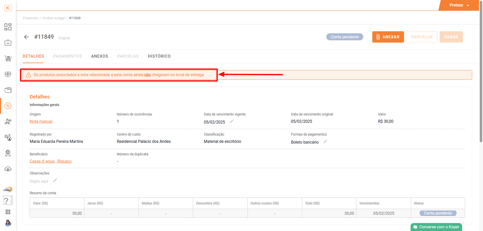 - Ao habilitar esta configuração, como mencionado, o pagamento da conta associada só poderá ser realizado após a confirmação de que o material foi completamente recebido no local de entrega.