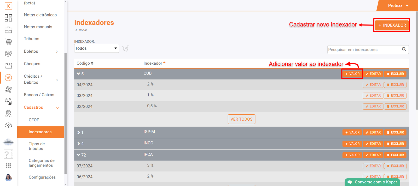 No Koper utilizamos idexadores para fazer a correção automática das parcelas do Contas a Receber. Este processo gera enorme vantagem para a gestão financeira, uma vez que a atualização das parcelas é totalmente realizada pelo sistema, sendo necessário apenas informar o valor do indexador.
