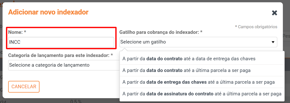 Preencha o nome do novo índice e escolha o "gatilho" para o início do uso do indexador: