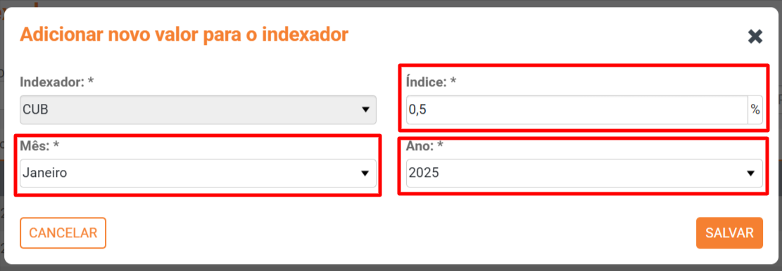 Você deverá preencher os campos conforme exemplo acima, utilizando os valores reais de cada indexador e período. Os campos obrigatórios são: