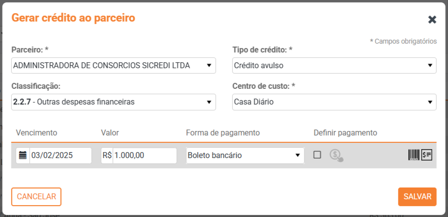 Para lançar um novo crédito, você poderá clicar no botão + CRÉDITO e preencher o: