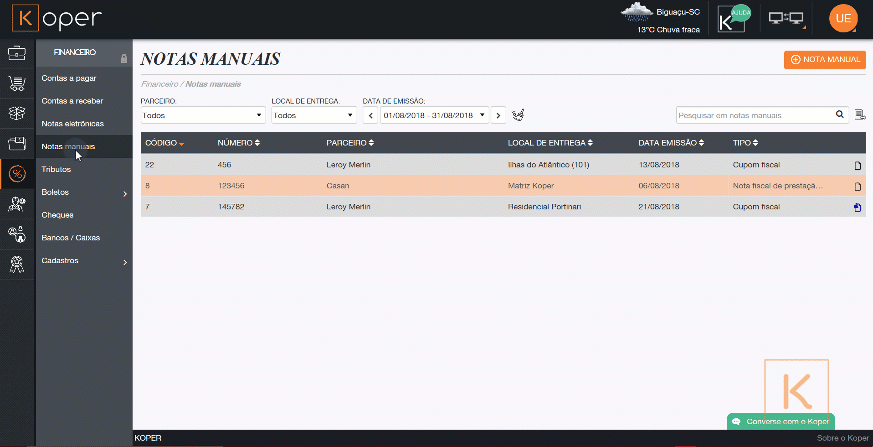 Para situações onde você não tem uma NFe, o Koper oferece a opção de criar uma nota manual, podendo vincular a uma ordem de compra ou a uma ordem de serviço. Depois de criada a nota ela gera um contas a pagar.