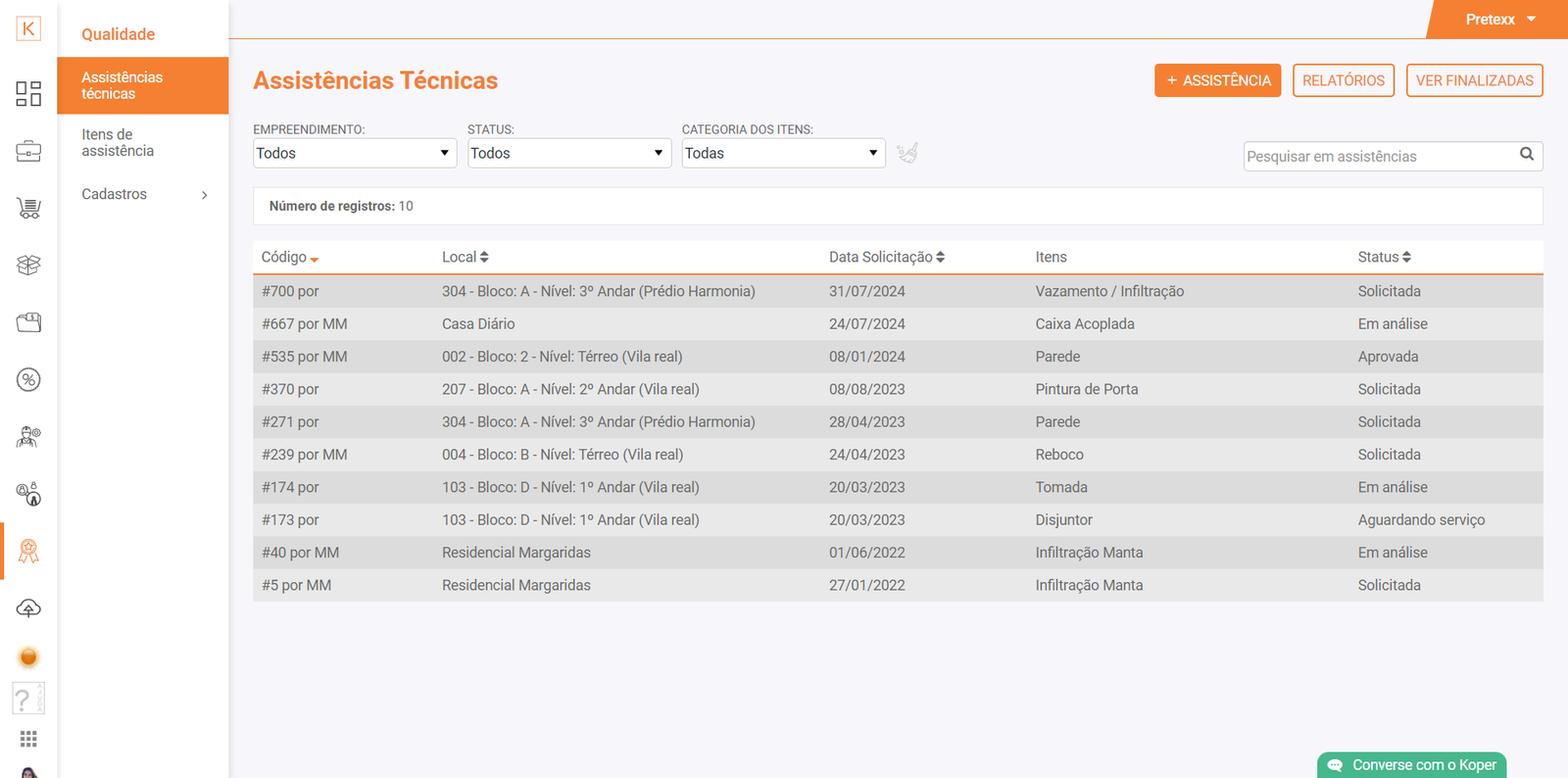 Em uma única tela é possível visualizar todas as assistências, tendo a opção de filtrar por etapas e/ou empreendimento. Mantendo um histórico completo de todas as assistências prestadas.