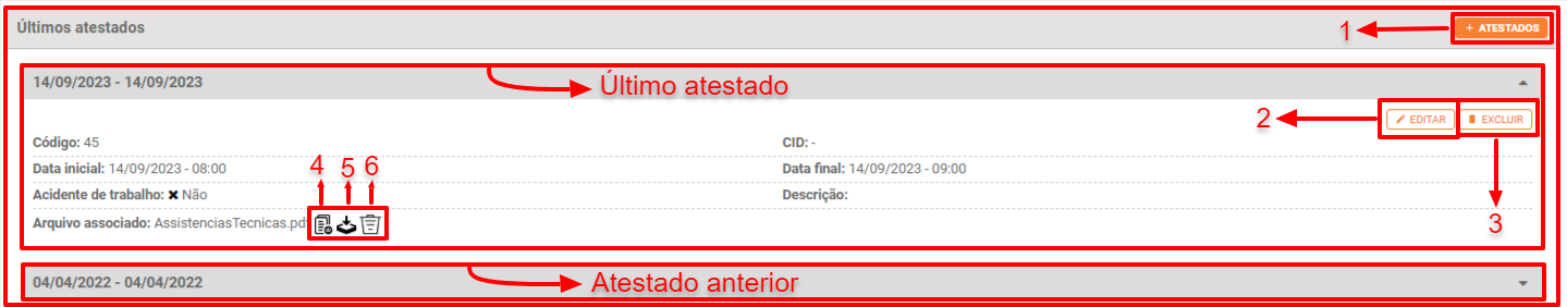 - No painel Últimos Atestados, identifique o atestado que deseja excluir e clique no botão