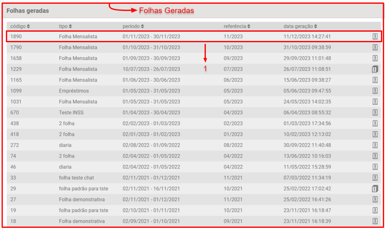- Também é possível ver as folhas geradas, indo em Folhas de Pagamento.