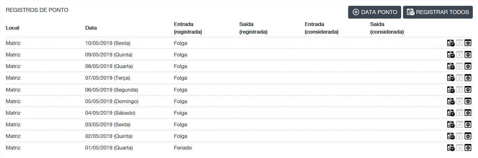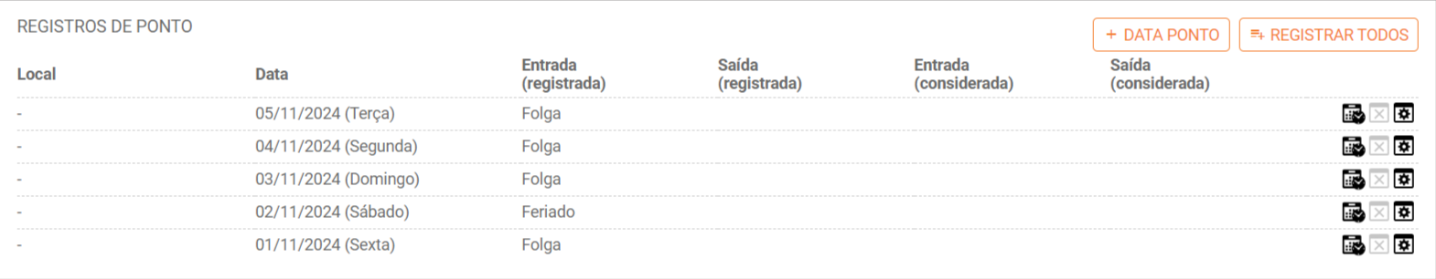 for exibido, significa que não é possível registrar batida de ponto do colaborador nesta data; - Depois que o ponto é registrado não é possível registrar falta;