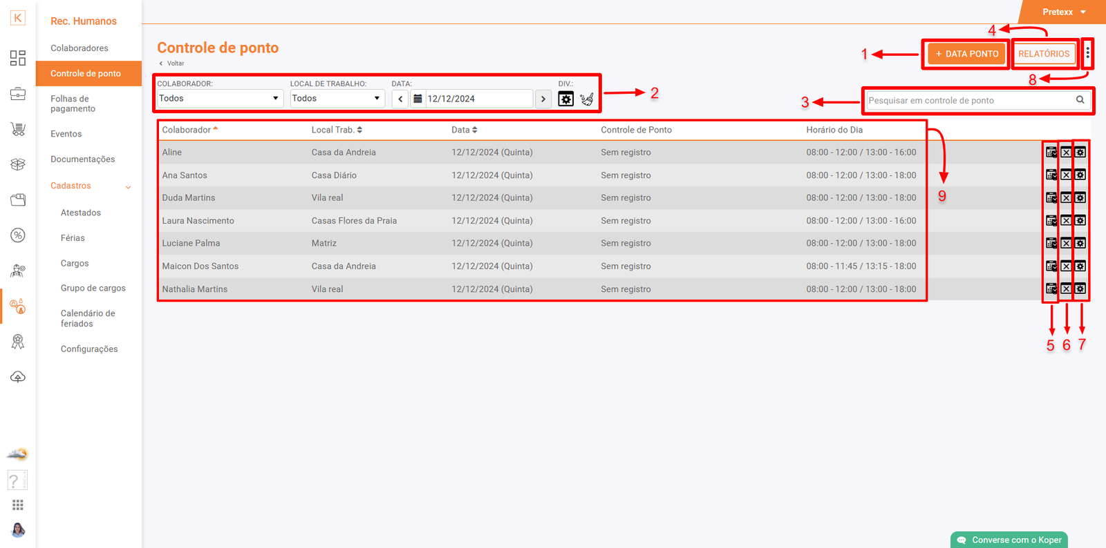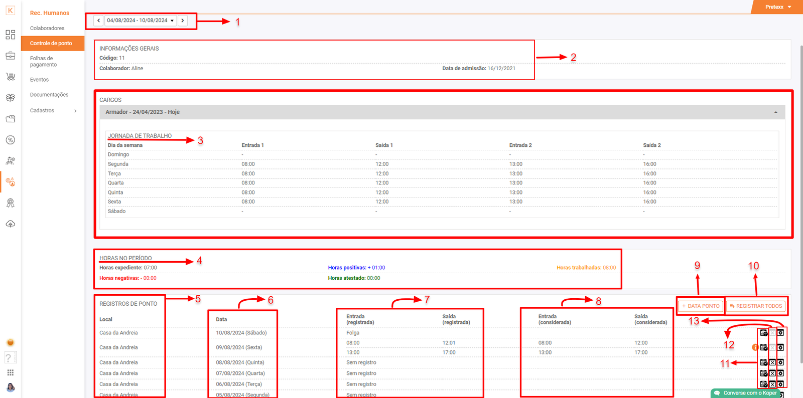 - 9: Abrir detalhes do controle de ponto de cada colaborador.