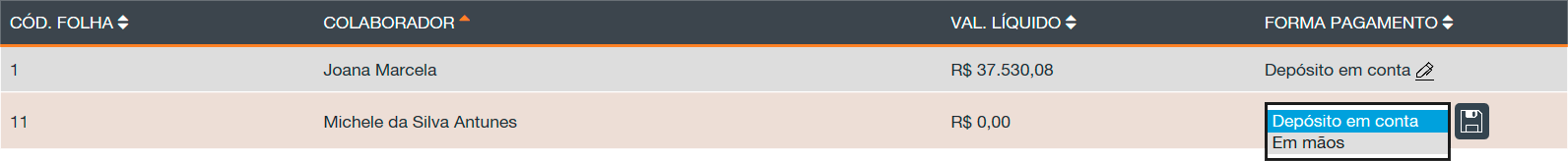 - Na folha do colaborador, na coluna FORMA DE PAGAMENTO clique sobre o ícone