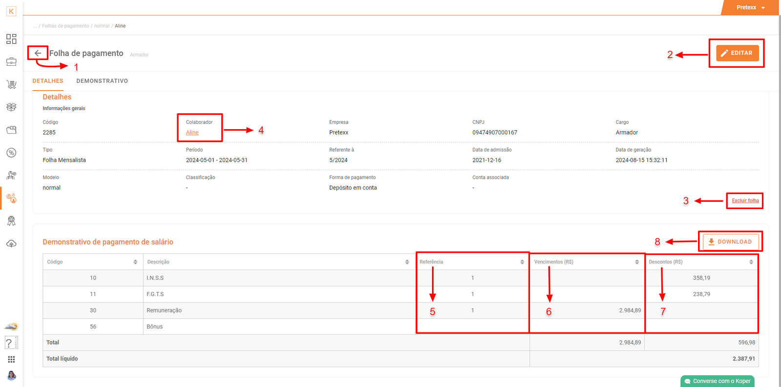 8 - Abrir detalhes de folha de pagamento de cada colaborador;