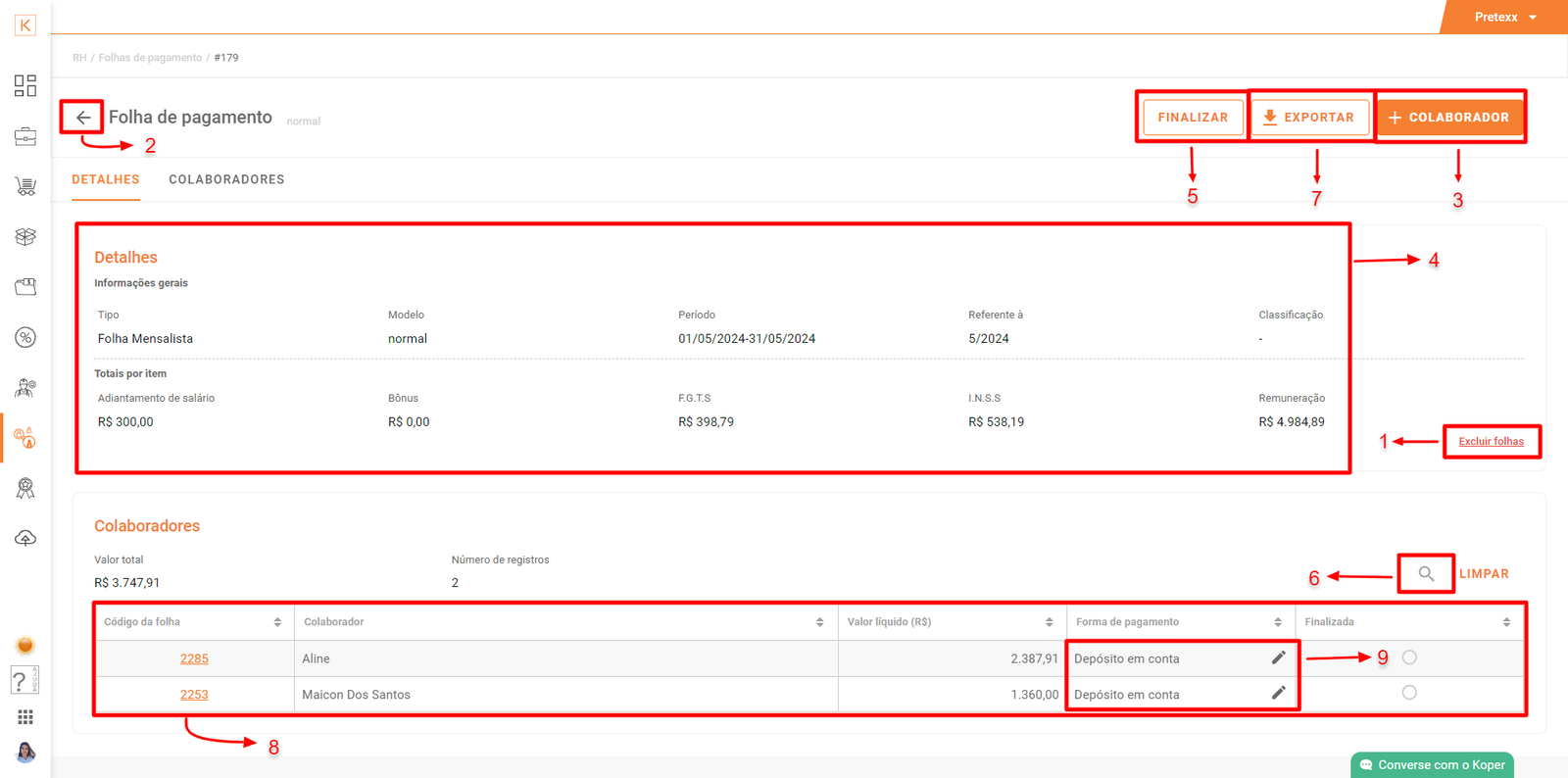 - As folhas só podem ser excluídas enquanto não foram finalizadas;