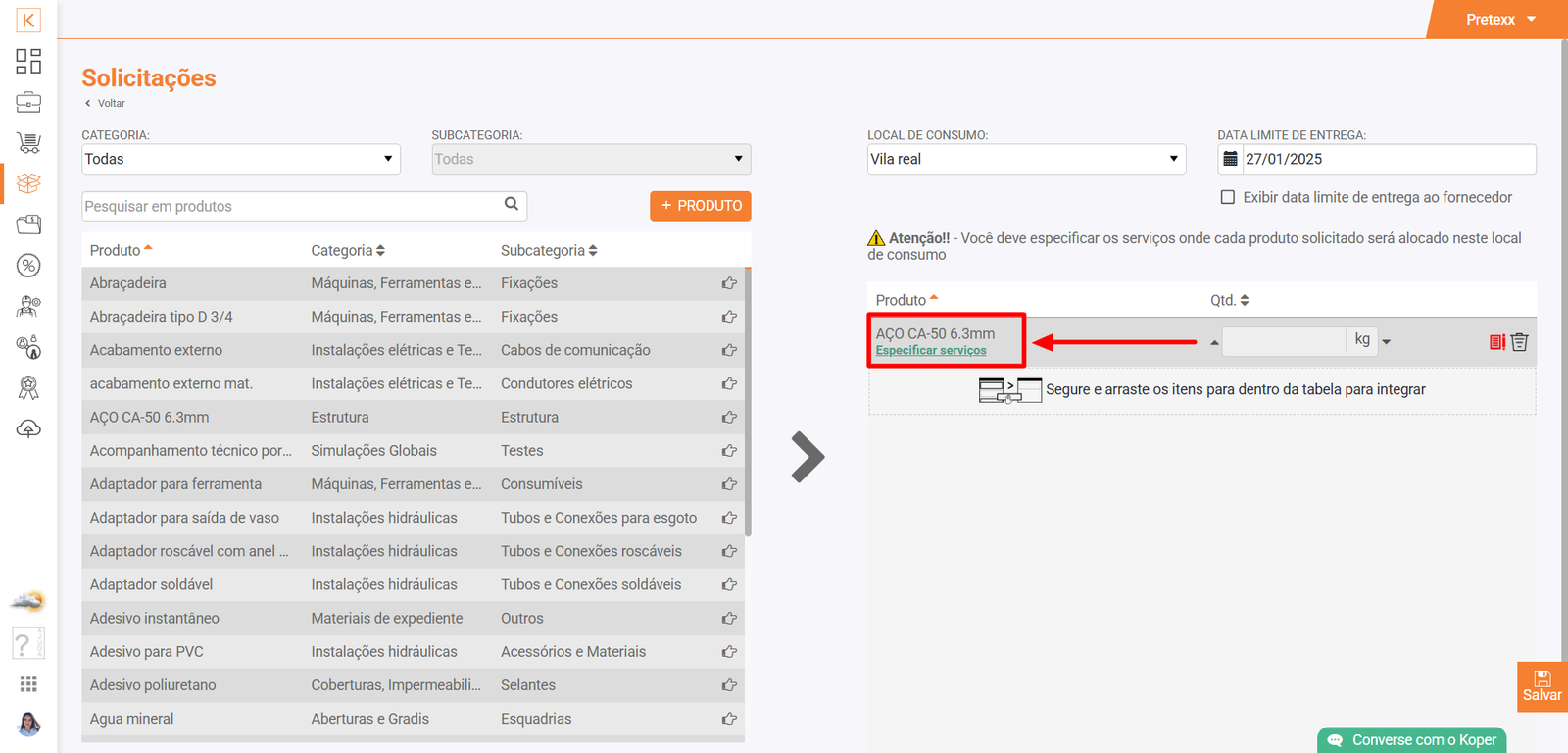 - Agora clique e arraste da lista da direita para a lista da esquerda o produto que deseja solicitar, ou clique sobre o ícone