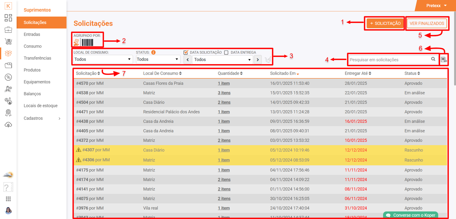 Acesse Koper > Suprimentos > Solicitações