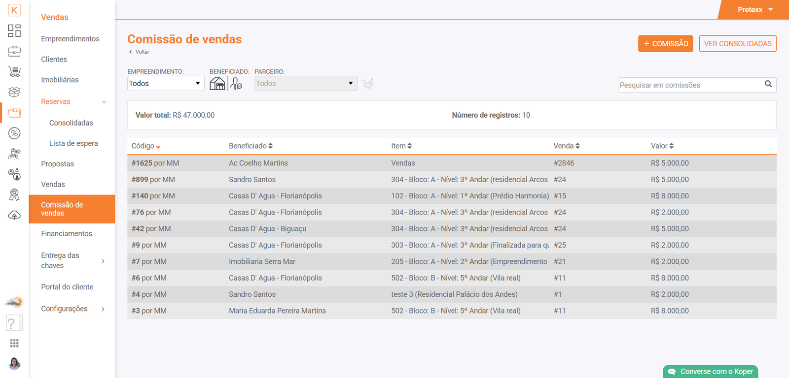 Nesta parte são dadas as baixas em comissões de vendedores internos da incorporadora ou a imobiliárias parceiras autorizadas a negociar unidades.
