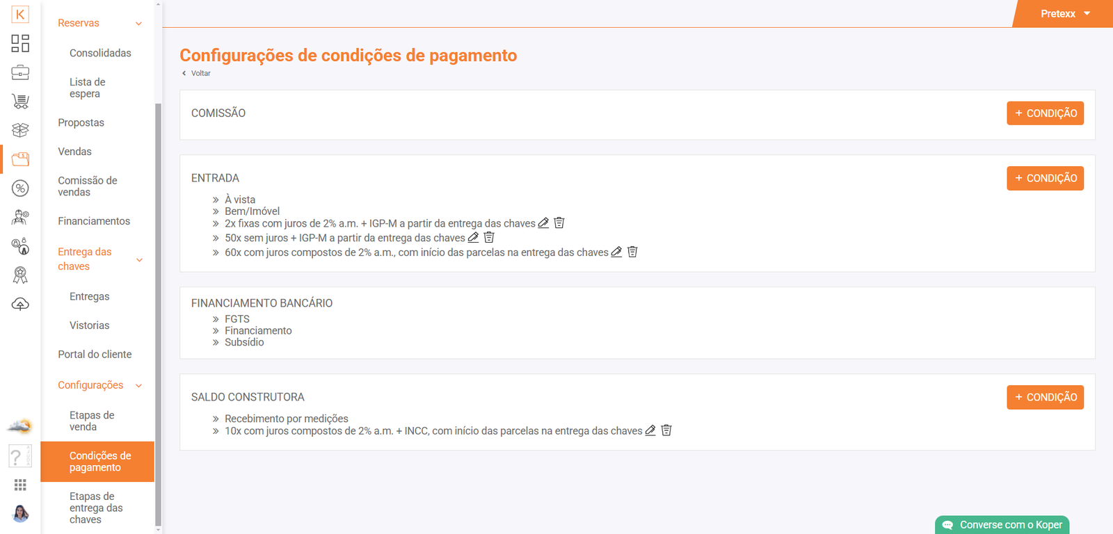 Use esta aba para adicionar novas condições de pagamento, sejam novos modos de entrada ou por saldos da construtora.